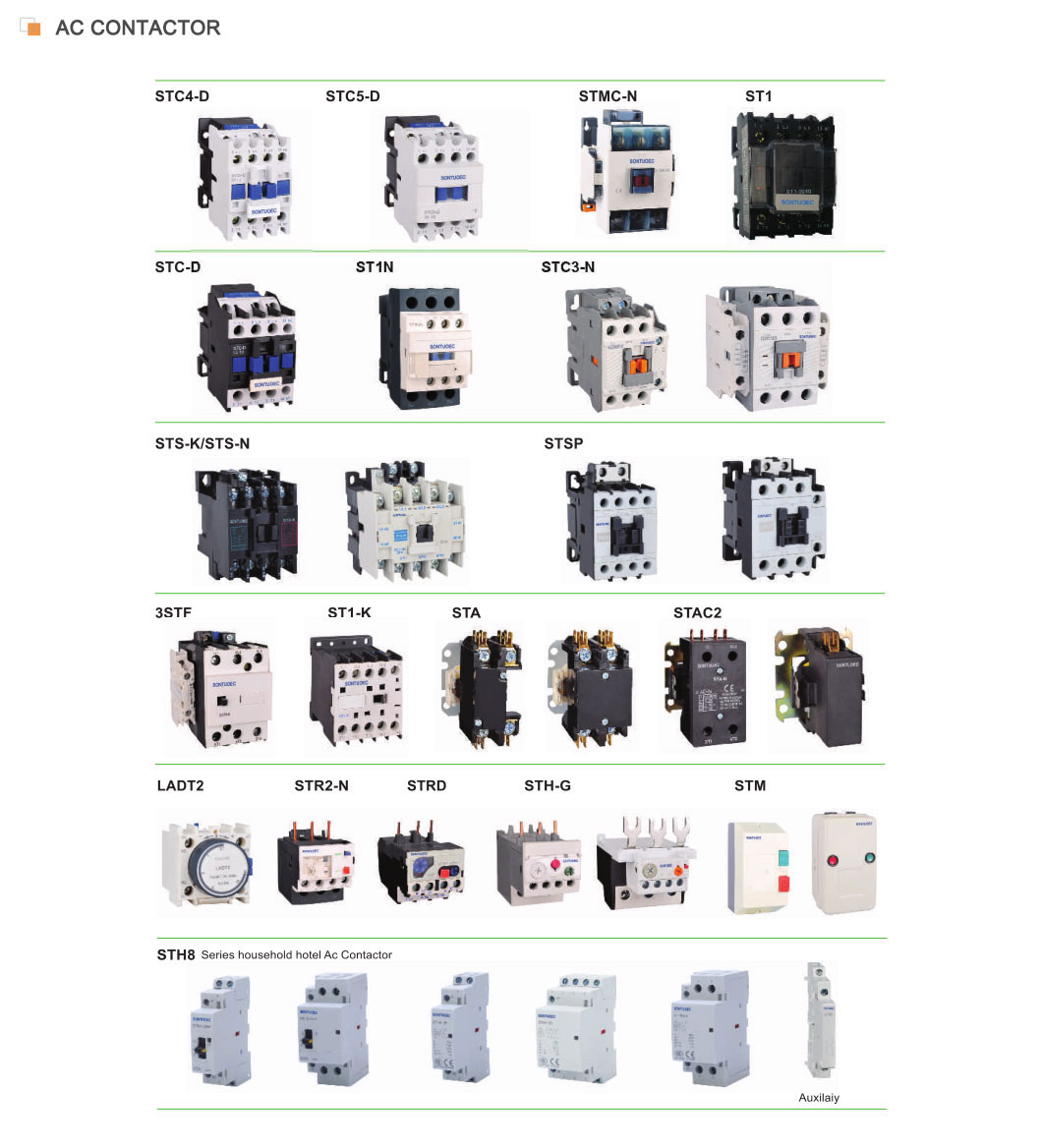 सोन्टुओक हे चिनी पुरवठादार/उत्पादकांपैकी एक आहे जे विविध लहान विद्युत उपकरणे एसटीएस-एन 95 मालिका एसी कॉन्टॅक्टर 220 व्ही, 380 व्ही 3 पीएसओनॉन सर्किटमध्ये 660 व्ही एसी 50 हर्ट्ज किंवा 60 हर्ट्ज पर्यंत वापरण्यासाठी योग्य आहे, ज्याची पूर्वसूचना 95 ए पर्यंत आहे, स्टार्टिंग आणि स्ट्रीटिंग स्ट्रीटिंगसाठी स्ट्रीटिंग. सहाय्यक संपर्क ब्लॉक, टाइमर विलंब आणि मशीन-इंटरलॉकिंग डिव्हाइस इत्यादींसह एकत्रित, ते विलंब कॉन्टॅक्टर, मेकॅनिकल इंटरलॉकिंग कॉन्टॅक्टर, स्टार-डेल्टा स्टार्टर बनते. थर्मल रिलेसह, ते इलेक्ट्रोमॅग्नेटिक स्टार्टरमध्ये एकत्र केले जाते. आयईसी 60947-4-1 नुसार कॉन्टेक्टर तयार केला जातो.